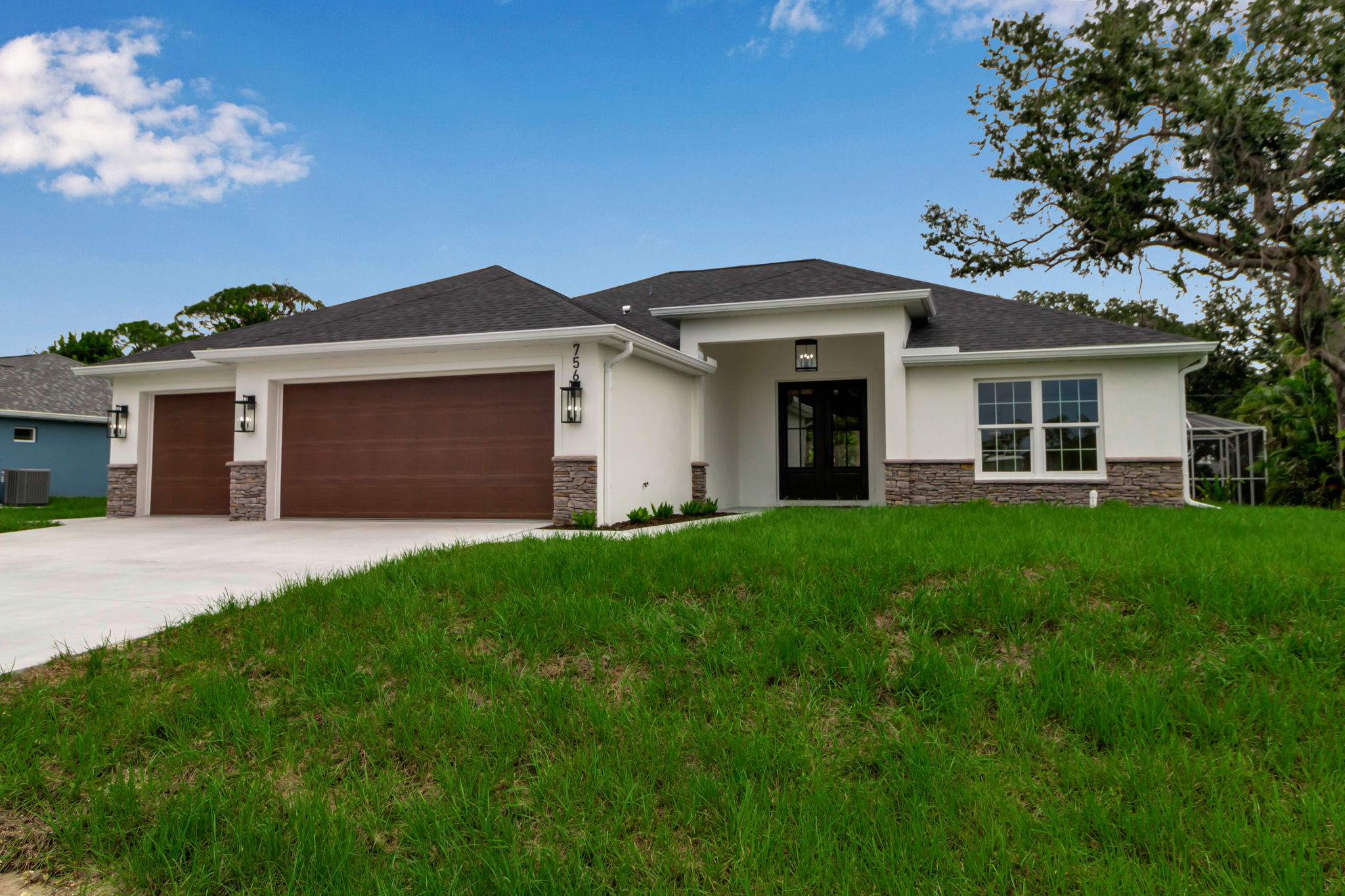 The exterior is warm and inviting, finished in soft stucco with a warm white tone and accented by elegant stone. Clean rooflines, large windows, and a charming covered entry create a refined first impression, while the three-car garage enhances both curb appeal and practicality. The overall look is fresh, coastal, and enduring — a design that feels right at home in Florida’s landscape.