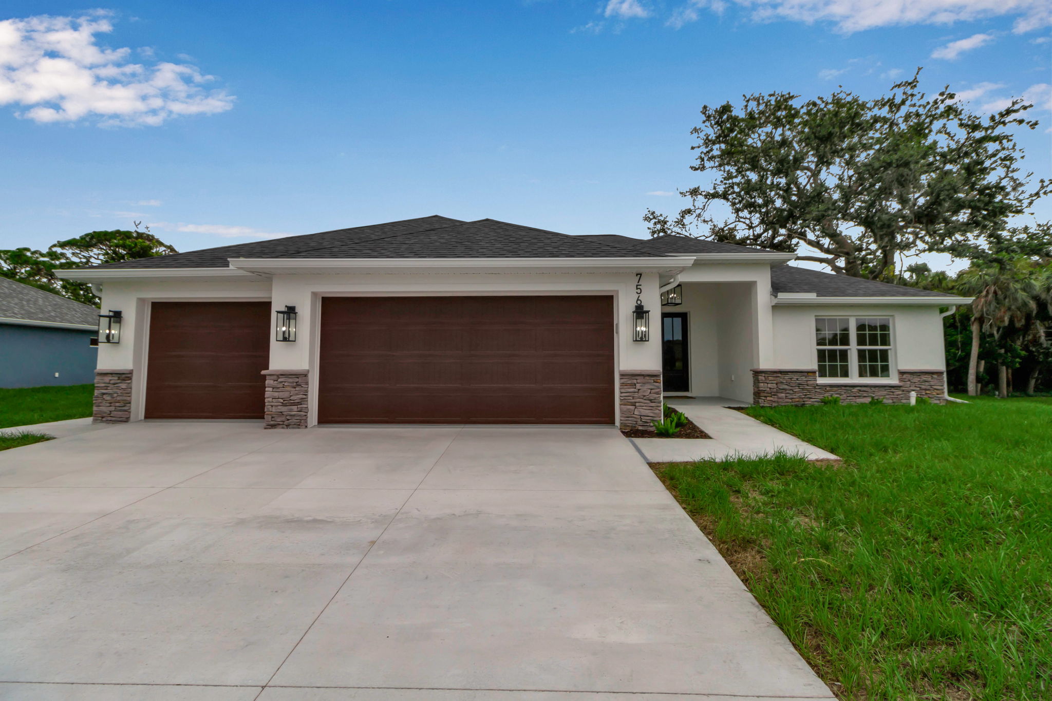 The exterior is warm and inviting, finished in soft stucco with a warm white tone and accented by elegant stone. Clean rooflines, large windows, and a charming covered entry create a refined first impression, while the three-car garage enhances both curb appeal and practicality. The overall look is fresh, coastal, and enduring — a design that feels right at home in Florida’s landscape.