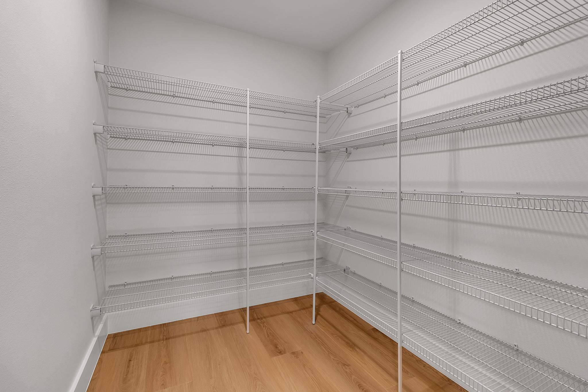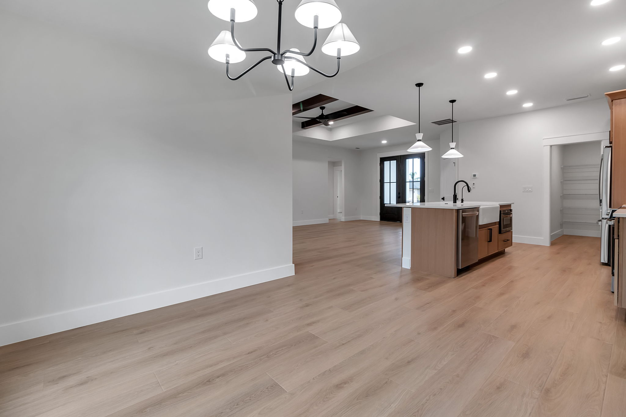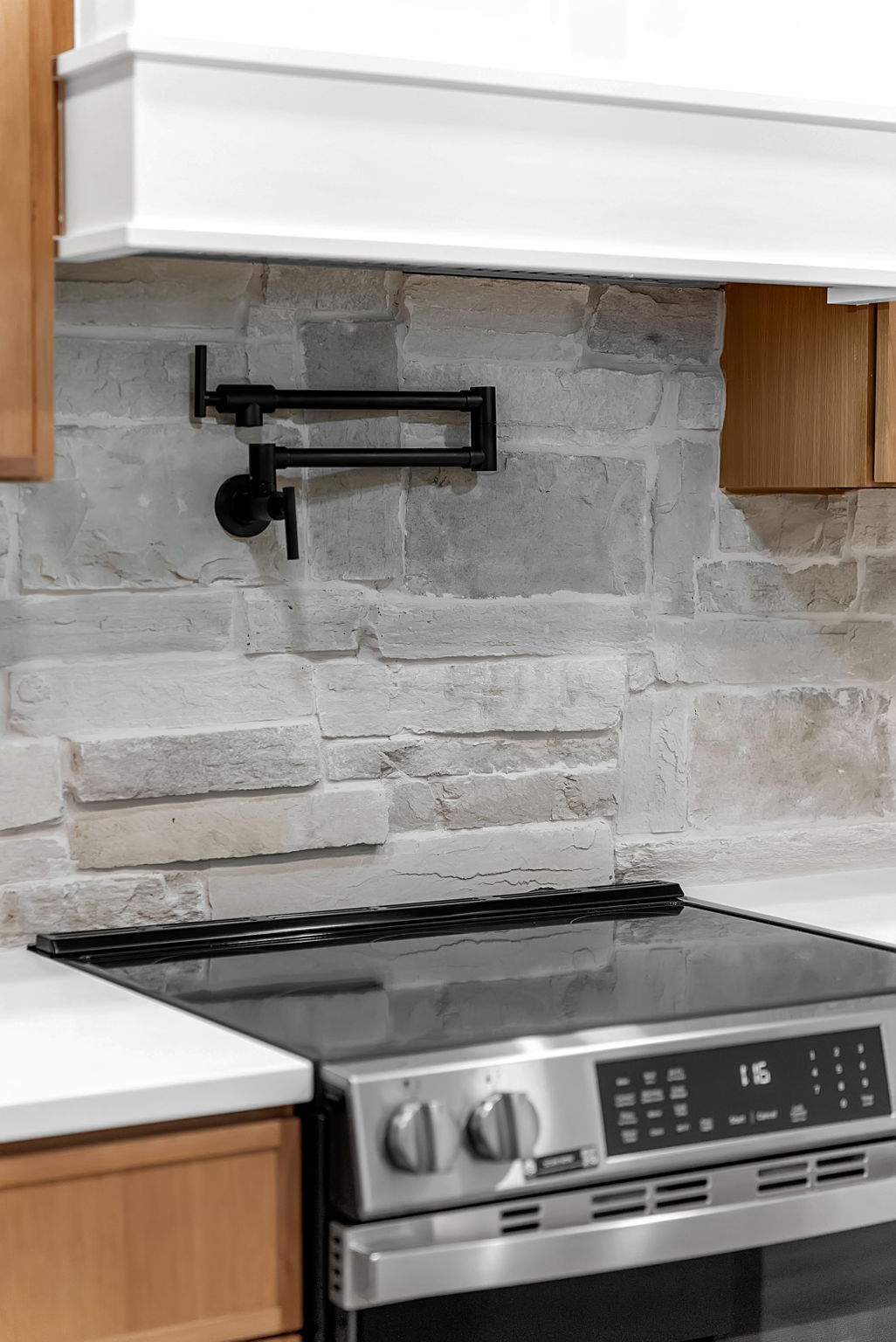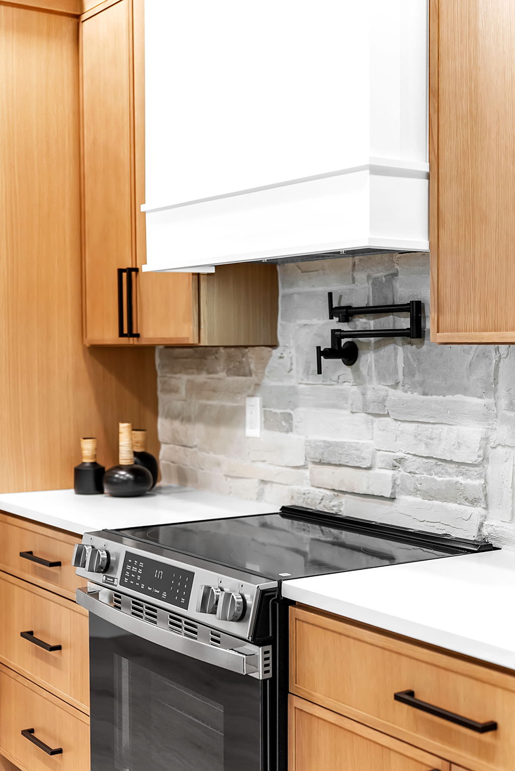 The kitchen is a true highlight, showcasing slim shaker-style wood cabinetry, a white stone backsplash, and a built-in white range hood for a clean, cohesive look. Black-and-white pendant lights above the island and a coordinating dining fixture add the perfect touch of personality and contrast, striking a balance between trend and timelessness. A generously sized pantry with a pocket door adds both storage and a subtle design flare.