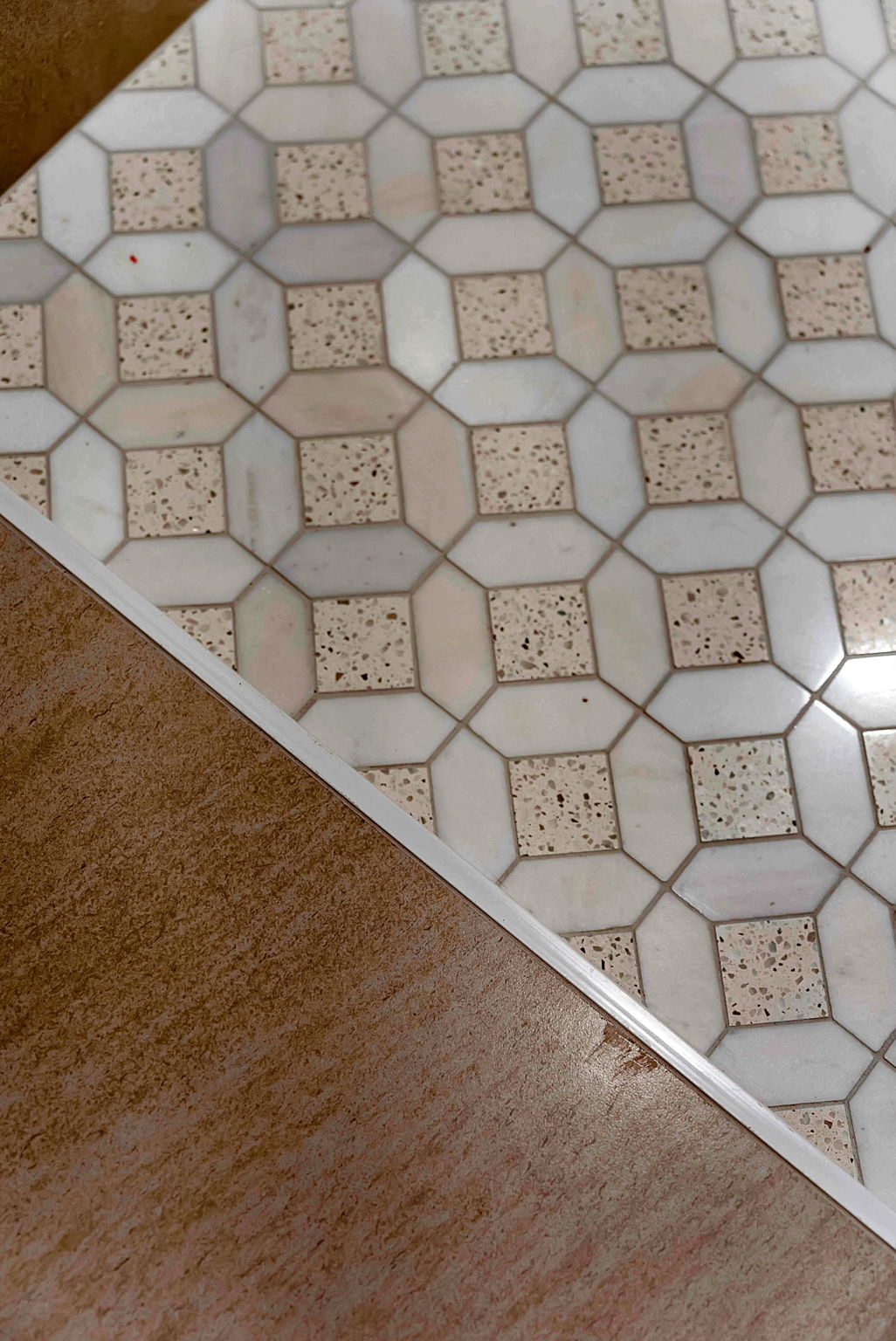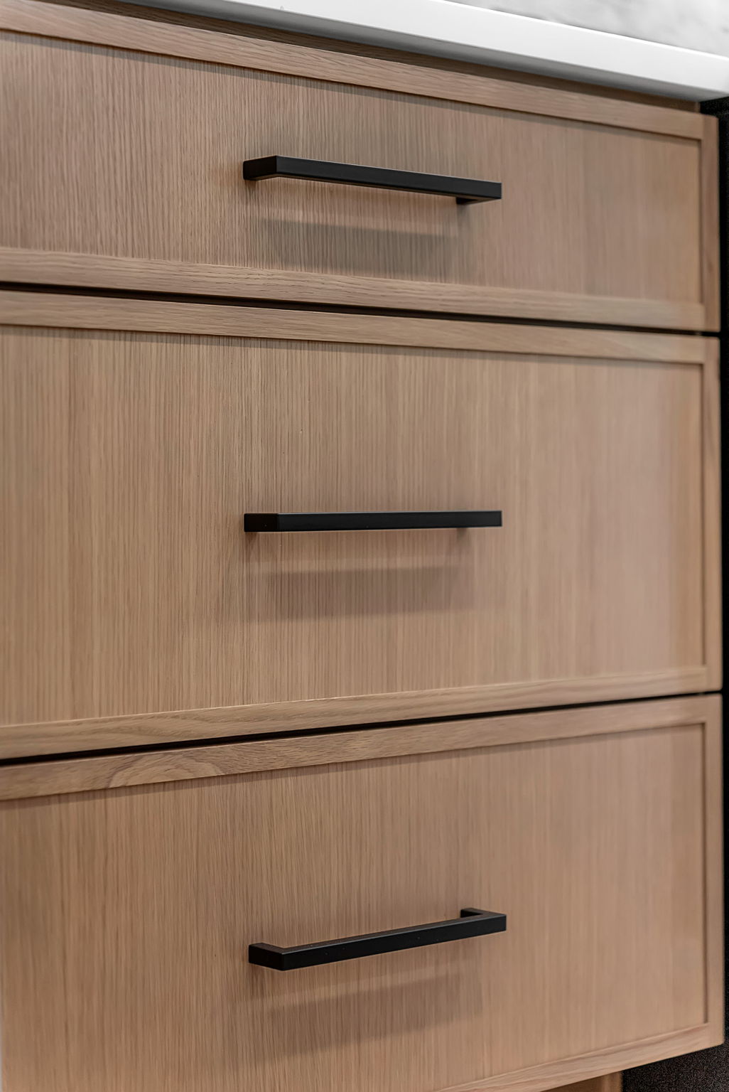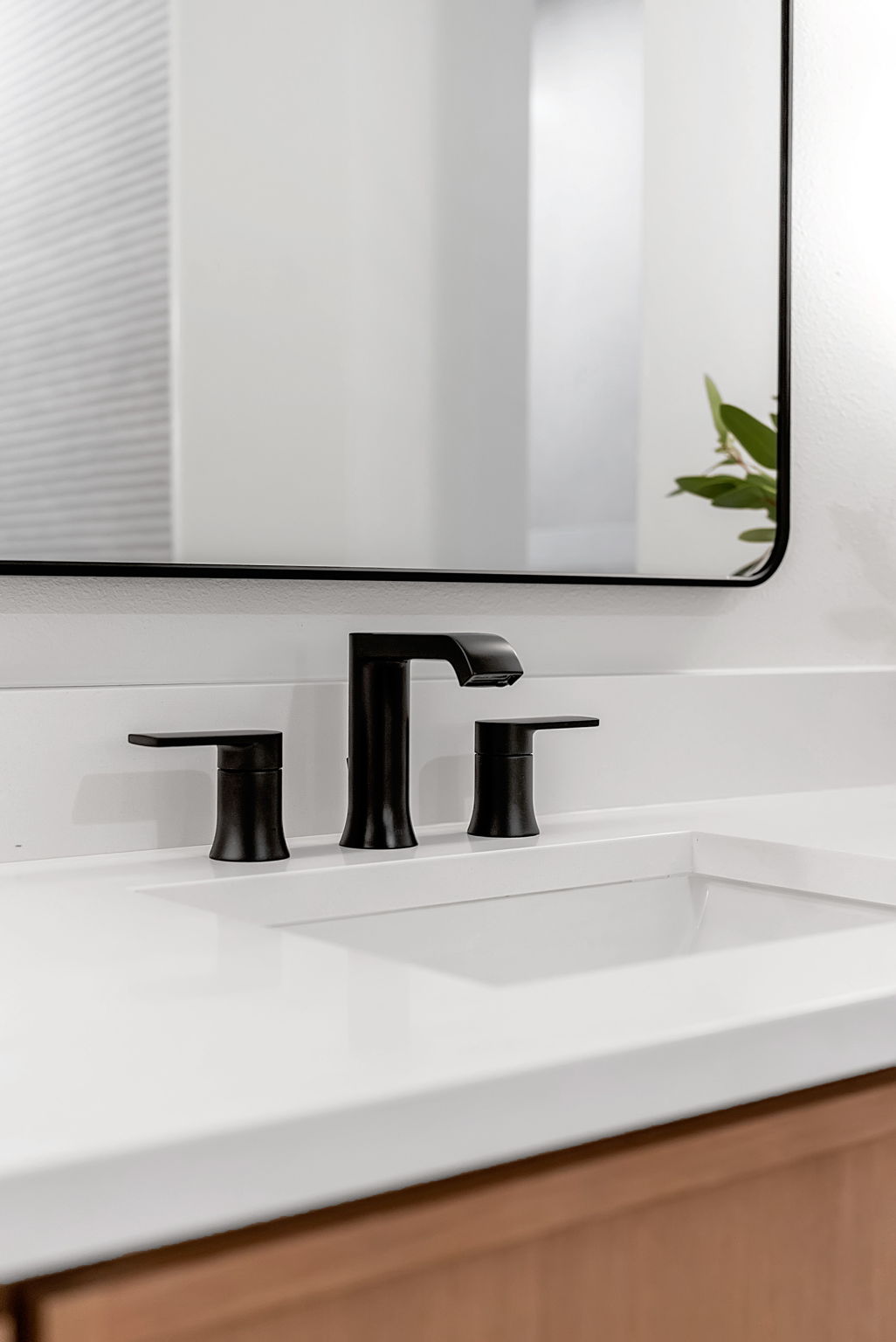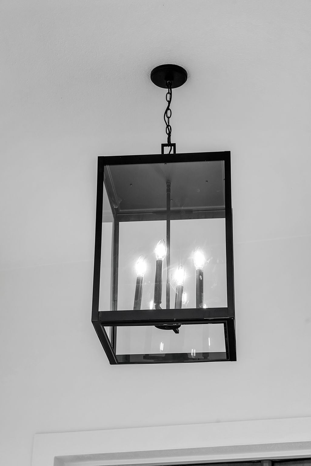 The kitchen is a true highlight, showcasing slim shaker-style wood cabinetry, a white stone backsplash, and a built-in white range hood for a clean, cohesive look. Black-and-white pendant lights above the island and a coordinating dining fixture add the perfect touch of personality and contrast, striking a balance between trend and timelessness. A generously sized pantry with a pocket door adds both storage and a subtle design flare.