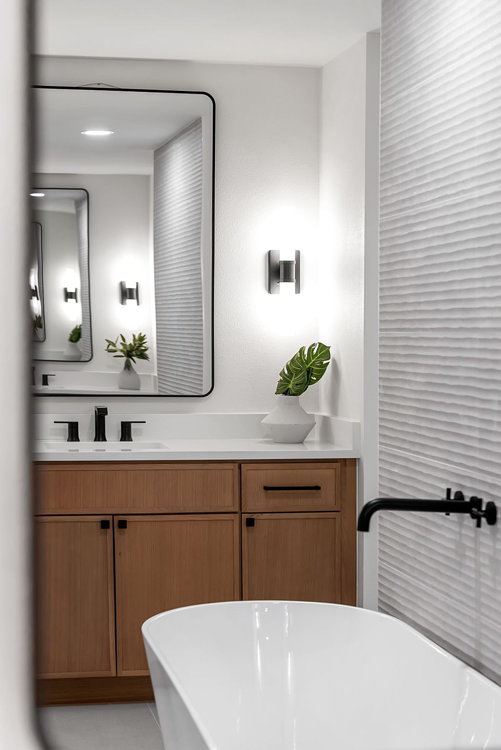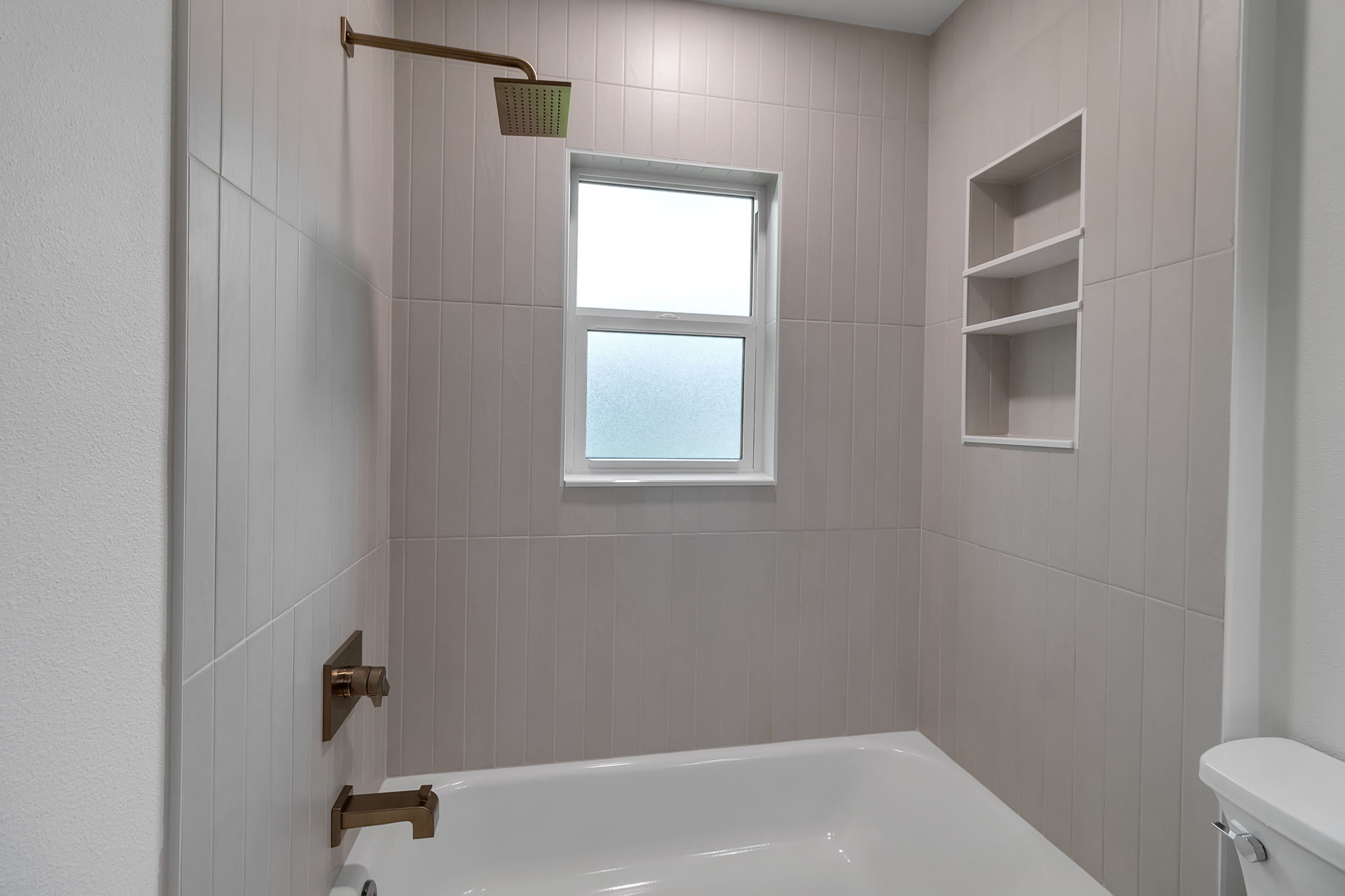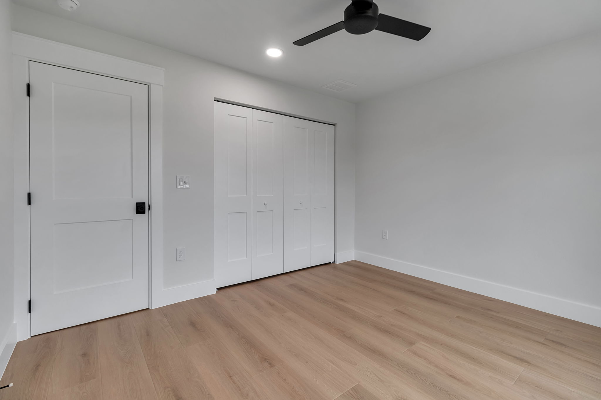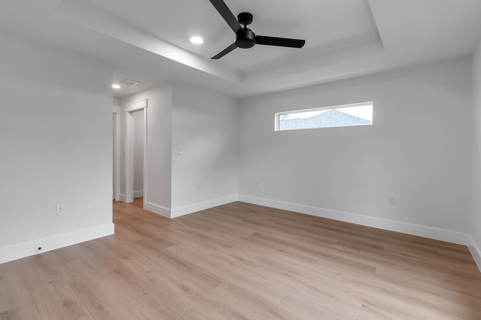 The split floor plan offers both privacy and flow. The primary suite is tucked to one side of the home and features two walk-in closets. A private hall leads to the en-suite bathroom, where a freestanding soaking tub takes center stage, complemented by dual vanities and a walk-in shower with refined tile details. On the opposite side of the home, two additional bedrooms share a full bathroom, designed with the same level of thoughtful finishes.